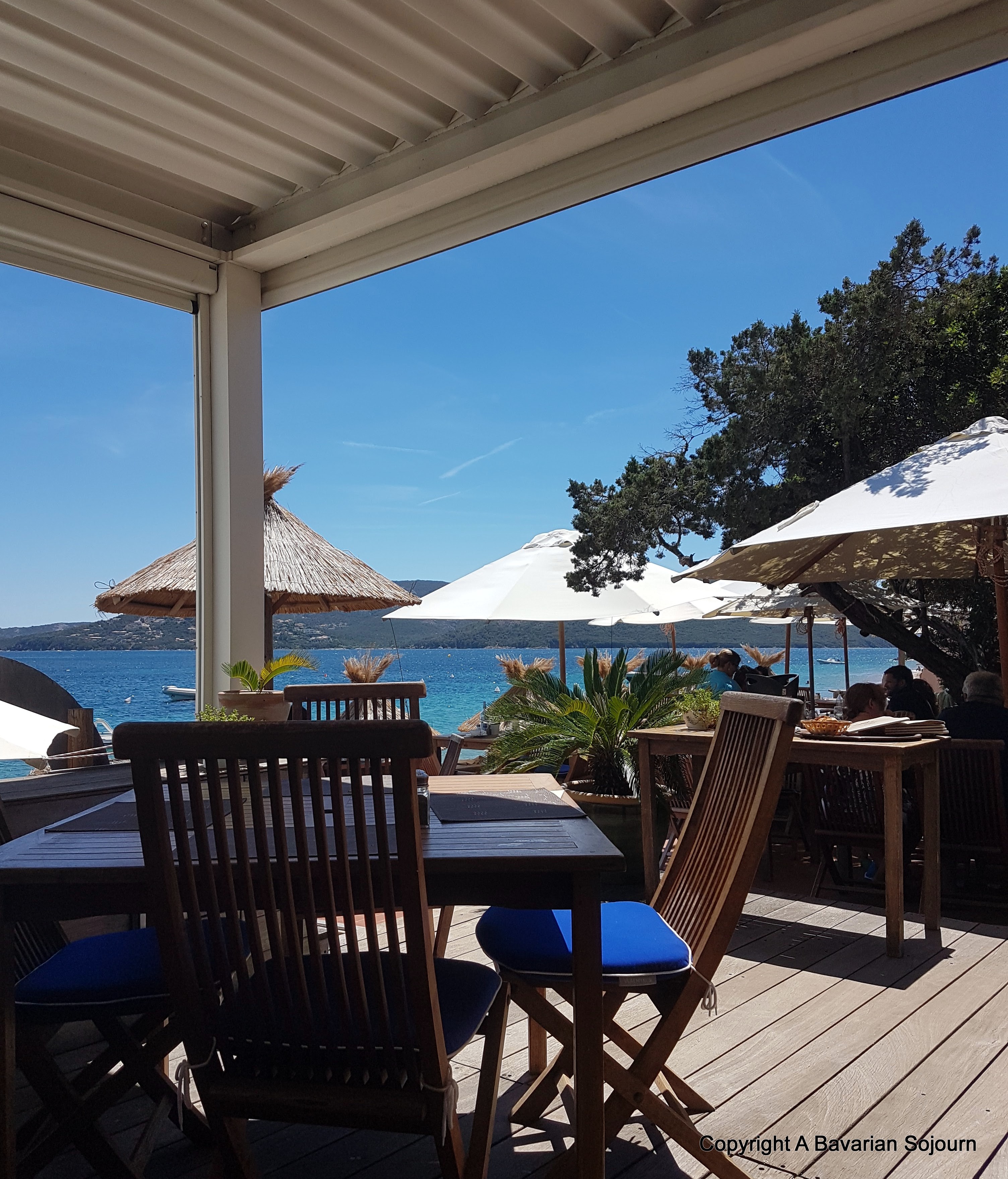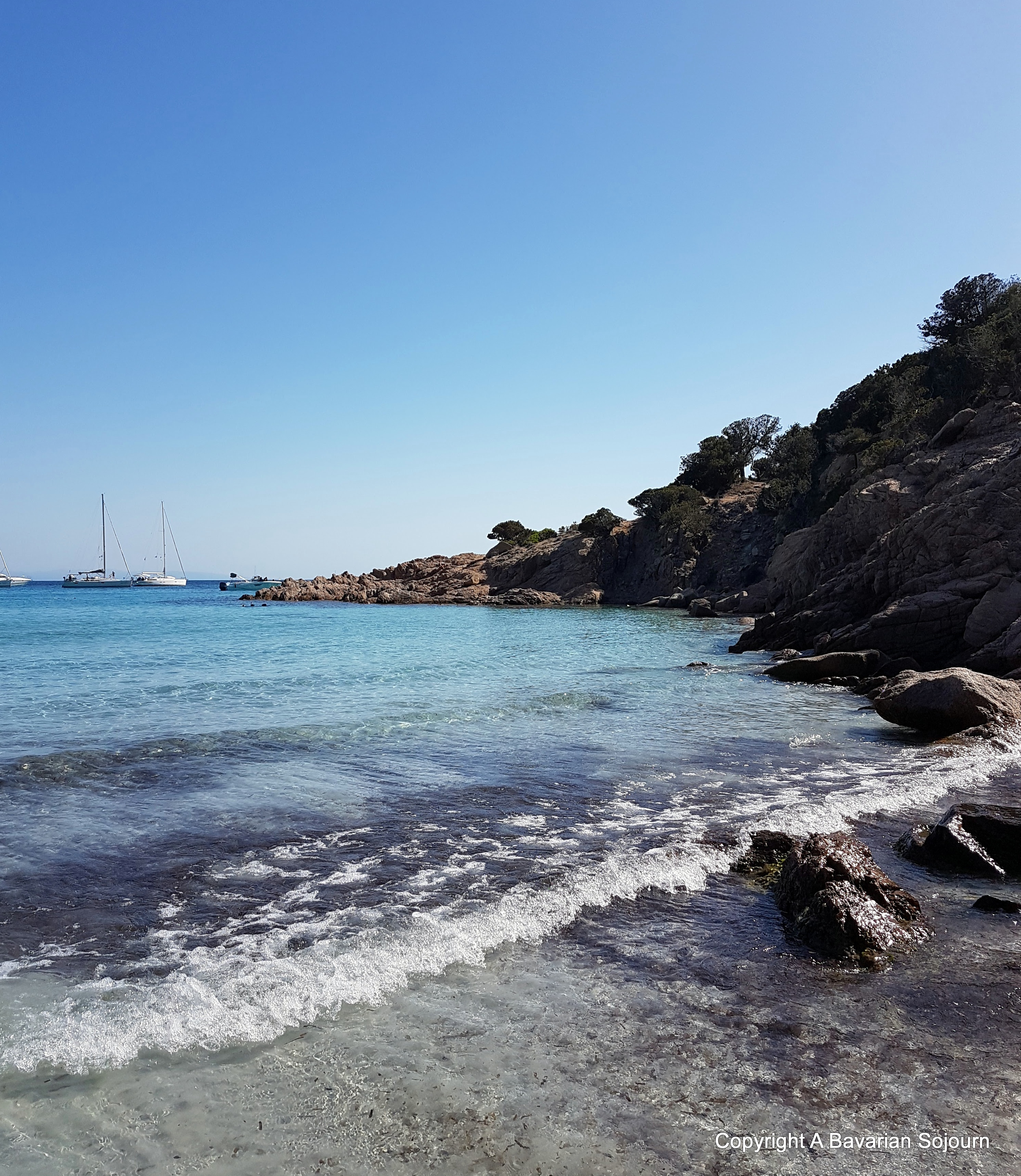 Our “local beach” as our Villa came with a complimentary parking spot for this beach (€10 per day otherwise!) so naturally, this was the first one we explored. From the car park you walk through a nice looking boardwalk restaurant and on to an umbrella covered stretch of sand. Now, you would be forgiven for pitching up here for the day and taking advantage of the rental sunbeds with waiter service, but if like us your kids want a bit more sand to play on (without covering your bright orange French neighbour in sand as they continue to fry themselves), then turn right and keep walking. Climb up through the rocks at the end, head through the little pine tree covered sandy track, and it will eventually spit you out in a sheltered rocky cove. Yes, this can also get quite busy, but given the natural shallow swimming lagoon these rocks form, your children will think they are in some kind of utopia with great snorkelling to be had in the crystal waters, tiny hermit crabs that scuttle about the place to inspect, plus plenty of parent worrying rock climbing availability too. The smallest member of our family spent a few happy sessions just sat in the shallowest part of water here, scooping up sand with his bucket and chucking it over his Dad. We liked this beach a lot.