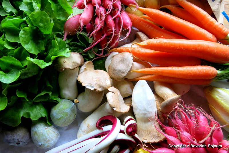Fondue has to be one of the easiest things to make for a crowd of people too, and you can counterbalance the slightly unhealthy mass of cheese with piles of fresh vegetables, fruit and meats to dip, alongside the traditional bread. The picture at the top shows my haul (including radishes, figs, porcini, chicory, baby carrots, radicchio and baby new potatoes if you are looking for ideas) at the Viktualienmarkt in Munich especially selected for one such soiree (I fried the porcini in butter beforehand – not so healthy!), and alongside this treasure, we piled wooden boards high with grapes, chunks of apples and pears, all manner of pickled onions, gherkins, sliced sausages and smoked ham. I can’t think of a more sociable meal, or a more dangerous one if there’s schnapps involved….