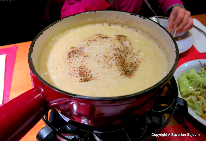 Settling for the place she liked the look of best – it was Fasching (Carnival) at the time, and there were people in fancy dress inside – we made the mistake of opting for a Fondue for 4. When I say mistake, I mean it in the nicest possible way. Being forced to eat your own bodyweight in melted cheese when your offspring decide (after several smothered cubes of bread each) that they are full is probably not that much of a hardship looking back.
