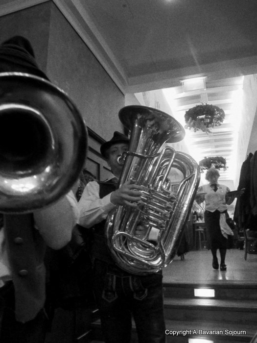 A couple of beautiful helles (light biers), a plate of suckling pig and potato dumplings later, we were sufficiently stuffed. But not stuffed enough that we couldn’t manage the local speciality pudding a big pan of kaiserschmarrn, which consists of pancakes fried in butter with raisins, apples and sugar – delicious! Well it was damp and cold outside, we did need some kind of inner thermal protection! As far as anniversaries go, it was one of the best yet. We were even serenaded by the two above, who weren’t quite playing traditional Bavarian music as one might expect. In this picture they are actually playing Mary’s Boy Child….