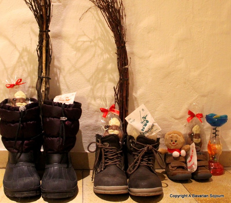 Over our St Martin’s Dinner recently (firmly on our calendar since we lived in Denmark) we’d chatted about the various traditions we have taken on from our adopted countries, so I couldn’t suddenly tell the children that St Nicholas didn’t visit England, even if I know that they are sadly too big to believe in such things nowadays (they’re not stupid, they just like the presents!). For the toddler’s sake at least then, boots were put in the fire place in anticipation of the usual tangerine, some kind of chocolate and a little gift or two left by the big man. Or twigs if they’ve been slightly hideous at any point (note last year’s picture below!!)… Of course, as is the case across the countries that celebrate him, Saint Nicholas has a helper, and this year I imagine that the Small People were quite relieved that Bavaria’s scary equivalent probably wouldn’t be making the journey (he brings the twigs by the way!) – we have had more than a few encounters with him over the years…