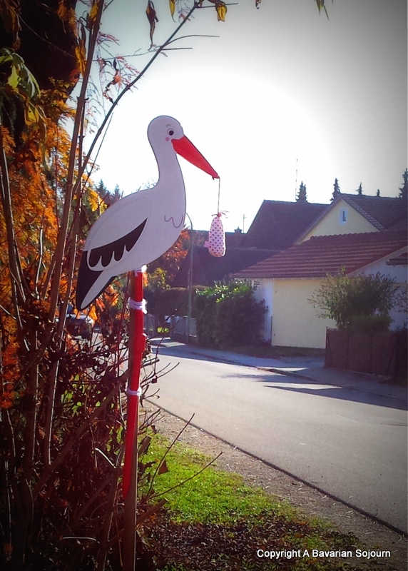 The storks are lovely aren’t they? They generally announce the baby’s name and arrival and quite often little clothes are pegged out too… This one was ours, but it blew down in a storm sadly – everyone else on our road who has had babies in the past year still has theirs up! :D