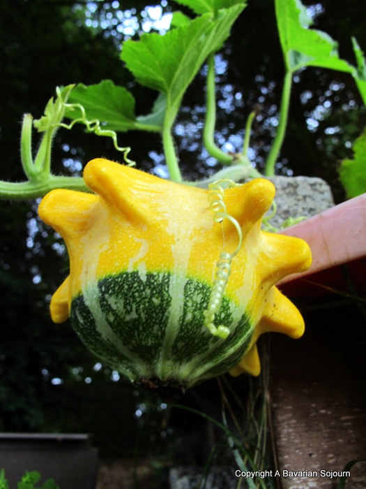 The position of the sand-pit/come vegetable patch turned out to be a bit shady too, meaning that the one plant that did well, did so through alien like means, snaking out of its alloted space and out across the garden to bear fruit. And instead of the the big orange pumpkins we were expecting it to produce, this bizarrely shaped yellow object appeared instead, just the one too!