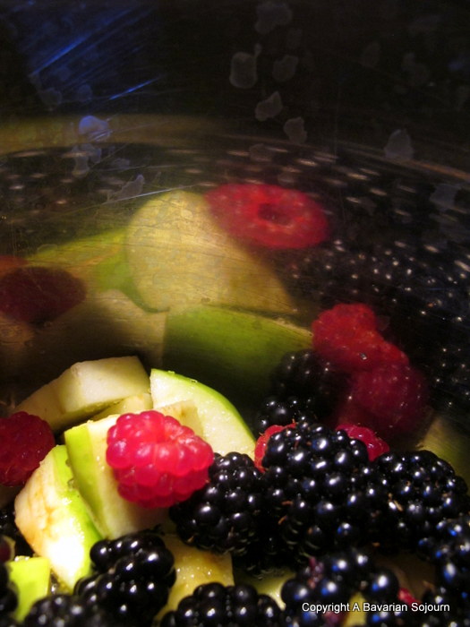 Fruit: 500g apples peeled and cut into chunks, 250g blackberries, 15g melted butter, a couple of tablespoons of caster sugar.