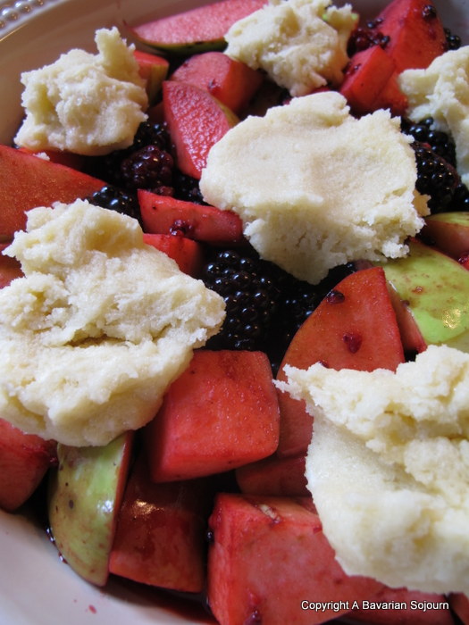 But we did get plenty of red-currants of course, and the blackberry bush felt sorry for us and joined forces with the apple tree to cheer us up. And because our Harvest was well and truly a load of old cobblers, this is what we made to console us – a big blackberry and apple cobbler, it has the same comforting properties as crumble by the way.