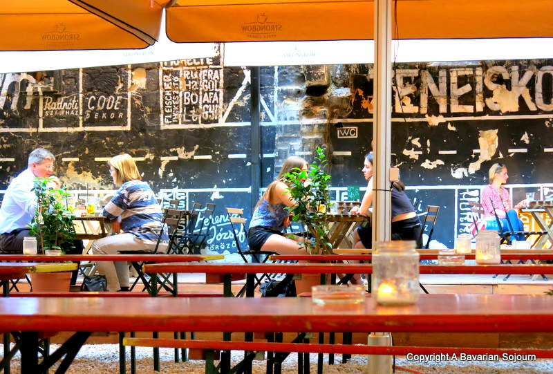 After an initial foray into the world of Budapest public transport (luckily I have a friend who recently relocated here, and she gave me a few pointers – buy ten tickets for around 3000 HUF at the purple machine at tram stops. You need one ticket for each tram/bus journey (children need a ticket each too!) we somehow ended up on Budapest’s “Broadway” – Nagymezo Street, and at Bordó Bisztró for dinner at what must be the perfect city summer venue.