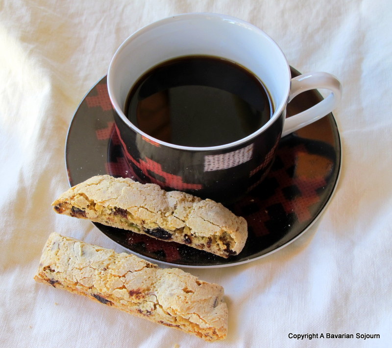 So, in keeping with the Italian theme I seem to have going on at the moment, and to put these little green beauties to good use, what better than to include them in some biscotti, partnered with some delectable (what was supposed to be Easter) chocolate and some dried cherries?… Perfect alongside an early morning coffee in the Spring Sunshine…