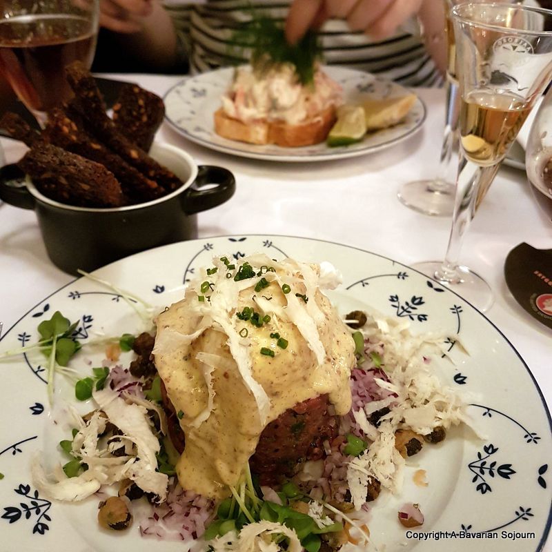 Herrings first! Curried, and topped with half a perfectly cooked boiled egg, followed by the most delicious steak tartare served with rugbrød fried in butter, and a further plate of smørrebrød topped with the sweetest Greenlandian prawns (we shared everything!).