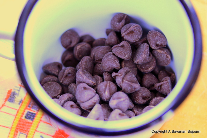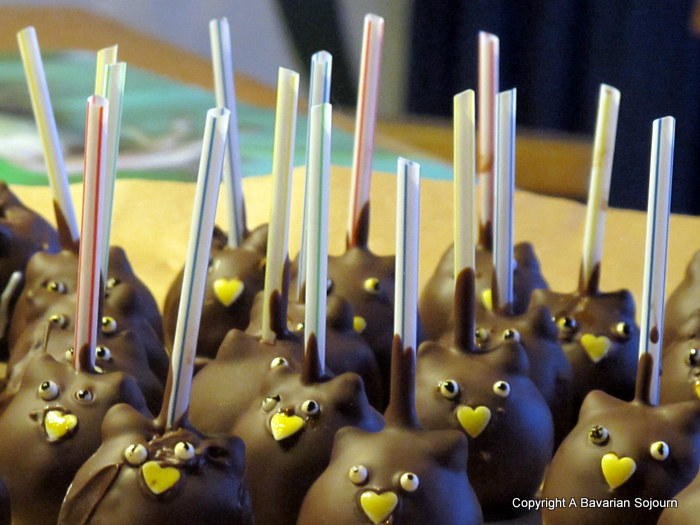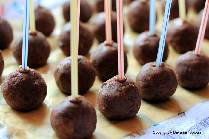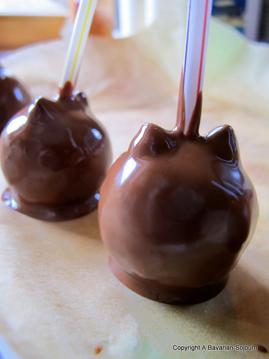 This next bit is up to you. You could be really virtuous and make your own cake, but to be honest I found the whole idea of baking cakes only to smash them into smithereens slightly depressing, so we bought a couple of brick shaped marble cakes to decimate, and made our own chocolate butter-cream to bind. You don’t need much mind, just enough to meld together in one great big lump. And when that’s ready, get your scales out and divide into little round bird-bodied balls, put them on a baking sheet, and stick them in the fridge for half an hour. When they’ve firmed up a little, you could stick in some lollipop sticks to make them look really professional, or (having not had the time to search the whole of Germany for them), you could consult your inner Blue Peter presenter (who at this point was yelling “improvise, improvise, improvise”) and just use cut up straws instead. I would also recommend using a little of the left over butter-cream to help cement the straw/sticks in place by the way, and to secure your owl’s chocolate drop ears accordingly, then stick them back in the fridge for at least an hour. After this you only need melt some chocolate, coat them lovingly, and then and spend the next half hour pulling everything out of the kitchen drawers in a panic as to what you can use for beaks and eyes when it’s Sunday and all the shops are closed. Thankfully, we managed to find a few decorations that sufficed, ignoring any suggestions from the Five Year old that the owls now looked like angry bird pigs. At this stage, they did.