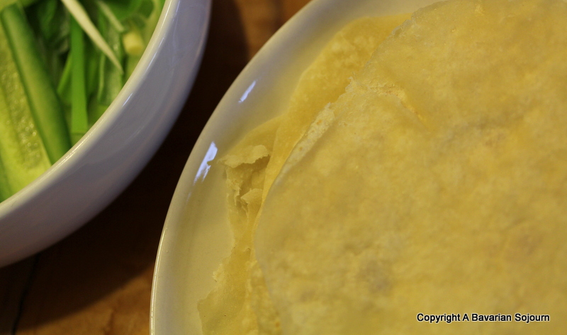 In a bowl, add the boiling water to the flour. Bring together and knead for around 3-5 minutes and leave it to rest for half an hour. Roll into a sausage shape and cut into 14 1″ pieces. Roll each piece into a ball and flatten slightly with a rolling pin. Do the same with another and paint the surface of the first pancake with sesame oil, place the other on top and repeat until you have a mini tower of pancakes. The theory is that you will be able to peel them apart easily thanks to the oil, and it does actually work. Like the Tortillas, cook in a dry frying pan over a medium heat for a couple of minutes per side.
