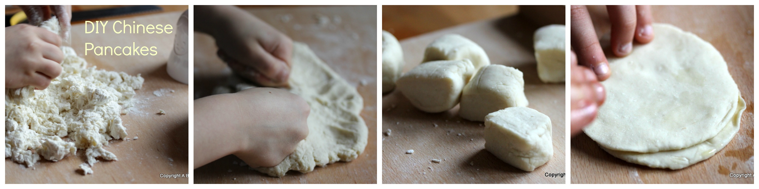 Peking duck is a little different to Crispy duck in that it’s roasted rather than fried, and then served sliced alongside the traditional accompaniments of sliced cucumber, spring onion, hoisin sauce and the all important flour pancakes. Which leads me on to this recipe! We can buy duck here from time to time, it’s usually pretty good and locally sourced and if you don’t mind the hassle, it’s great to make Peking Duck with (a topic for another Expat Essentials post perhaps!?) but this post is about the all important pancakes – whether you are making duck or pork Chinese dishes. This simple recipe is great fun for the kids too (if you do the initial boiling water part!), as I am sure you will notice the small hands in the pics! I got to do the final cooking bit too though!