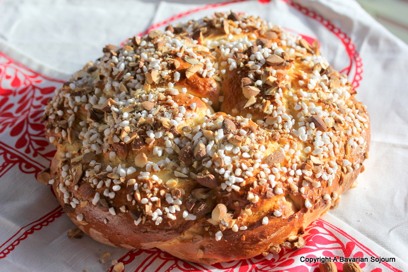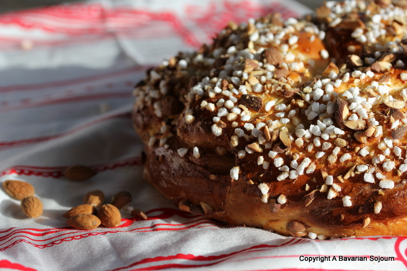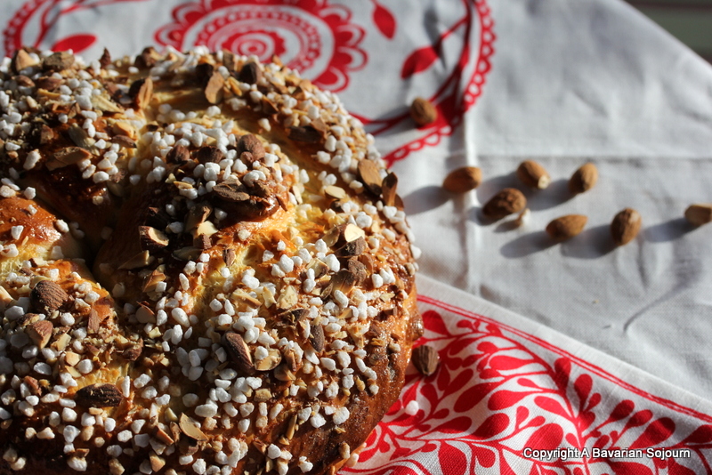 For the topping: 1 beaten egg to glaze, a large handful of freshly chopped almonds and a large handful of “hagel” sugar as it’s called here.