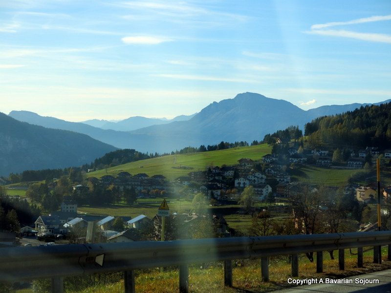 The way up isn’t that treacherous as mountain roads go, at least it isn’t in glorious Autumn sunshine – it’s just jaw-droppingly beautiful instead. A treat for the eyes as we covered roads that slowly unravelled upwards – spotting small villages perched precariously on the mountainside, admiring alpine forests in their final autumnal throes, and listening to the constant in-car soundtrack of “wows”, and “look at thats” as the peaks of the Dolomites we headed towards seemed to grow larger still (if you happen to enjoy driving on the twists and turns of roads like these, there are a couple of hair-pins to enjoy rather than endure as we did on the Splugen Pass a couple of years ago, but thankfully somewhat relaxed in comparison)!