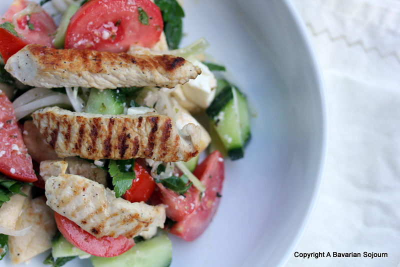 And a Greek Salad with crispy cubes of Pitta bread, and Grilled Turkey Breast (which I had to laugh at having just returned from Santorini!):