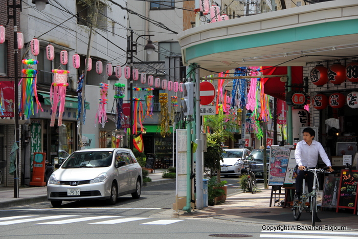 Preparations for the Tanabata Festival were underway whilst we were there, and as it a breezy day, the decorations provided a colourful display as we walked towards lunch, this time for slightly more adventurous fayre, in a very good izakaya with fish tanks in the window. I noticed Small Girl had been unusually quiet throughout the meal, the explanation for which was that she had been worried that this was about to fall on her head, which is understandable I suppose!