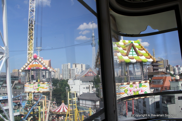 The afternoon was spent in the tiny but surreal Hanayashiki fun fair, which claims to be the oldest in Japan. After riding about on free range giant panda robots (chased after by both parents, slightly worried about them mowing people down), exploring the “Surprising House” and testing such rides as the Sky Tree, they both typically claimed that the very best thing about this place was the more down to earth crayfish fishing – crab fishing Tokyo style! These tiny aggressive creatures can’t help themselves when it comes to the sparkling metal lure attached to the tiny fishing rods, and sit their waving their pincers about until the temptation becomes so great that they suddenly find themselves hauled out into a waiting bucket. Once the fisher person has caught five in an alloted time, they are rewarded with a packet of sweet cigarettes (remember them?). I think both children would be quite content to still be sitting there now. Actually so would I.