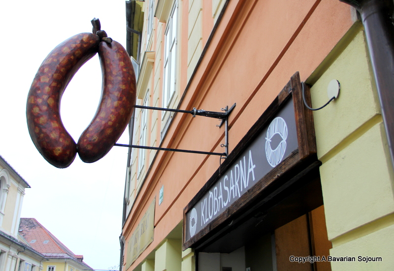 From here we took a little street behind the church, which could well be known as flower alley judging by the stalls. For the Small Boy however, it will probably forever be remembered as something else (probably rude) as he managed to get one shoe lace caught on the other, resulting in a completely overly dramatic fall (and a full accompaniment of wailing and moaning) that a professional footballer could possibly be proud of. Thankfully however, my children take after me in that they can usually be placated/comforted/blackmailed with food, hence a necessary klobasa pit stop. You can’t come to Slovenia and not try one at the legendary Klobasarna anyway (unless you are vegetarian obviously!), you can’t miss it, look for the giant sausages hanging outside the door!
