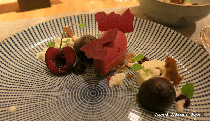 Having a very English sweet tooth, and a bit of a craving for cherries, I was more than happy with the dessert of Cherry, Rye and Sour milk, which consisted of cherries served several different ways – covered in chocolate, as a gel, sorbet and as a wafter, alongside sweet rye crackers, and tiny bubbles of iced milk, and milk panacotta. The Small people were presented with magnificent bowls of spaghetti eis, complete with generous shavings of white chocolate parmesan! Delicious!