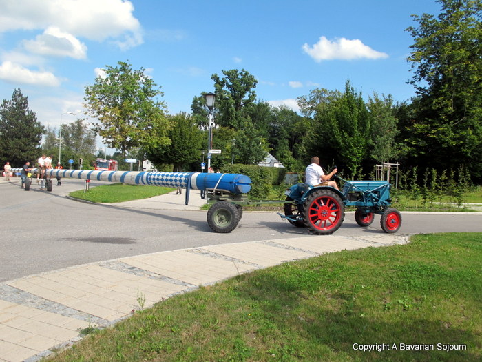 Once the Maibaum had been “felled”, a few locals hitched a ride on it as it was hauled up the road by elderly (but effective) tractor in anticipation of the next part of the ceremony. Lots of beer drinking was needed for this, as it undoubtedly helped with confidence and the easing of purse strings. An auctioneer stood with a tape measure, and with the help of a trusty assistant wielding a chainsaw, the pole was then ceremoniously sawn up into bespoke lengths depending on the bidder’s request! All the while raising money for good causes of course!