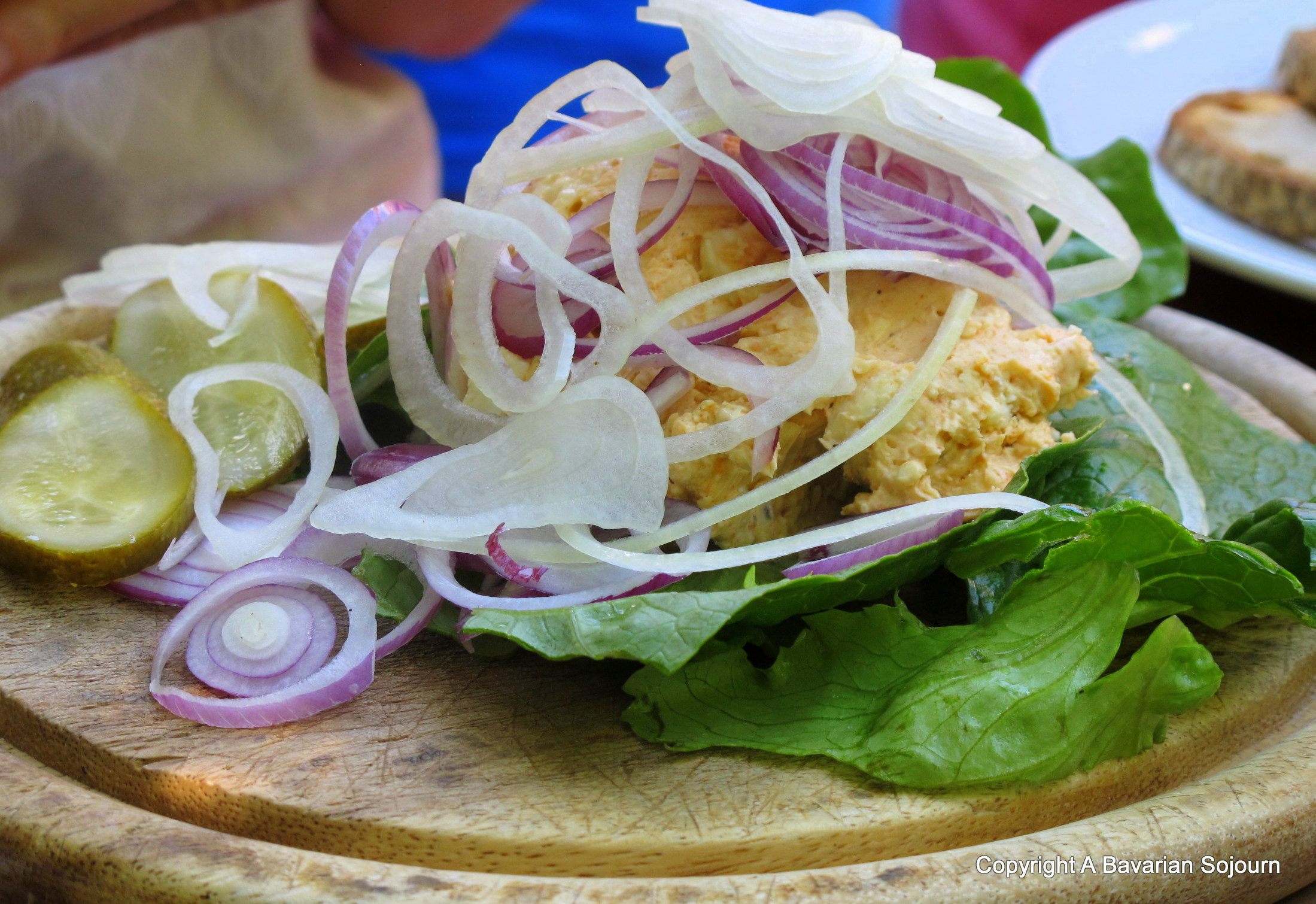 On we glided past yet more spectacular scenery, and as the day progressed and the sun got higher in the sky (and as the people around me got pinker and pinker still) I was suddenly grateful for that pub umbrella – especially as one of those types of English people that the German’s lovingly term “shade lovers”. Thankfully though, more leafy shade was in sight as a little like an oasis appearing on the horizon, we found ourselves stopping off at a beautiful riverside bier garten for lunch (included in the price!) along with the passengers from the other rafts. You don’t see much of the other rafts by the way, there’s usually plenty of space between them… It was interesting to note the mix of people – from the traditionally dressed (and by now perspiring!) to the not so, and the rather reserved, to the definitely not so…