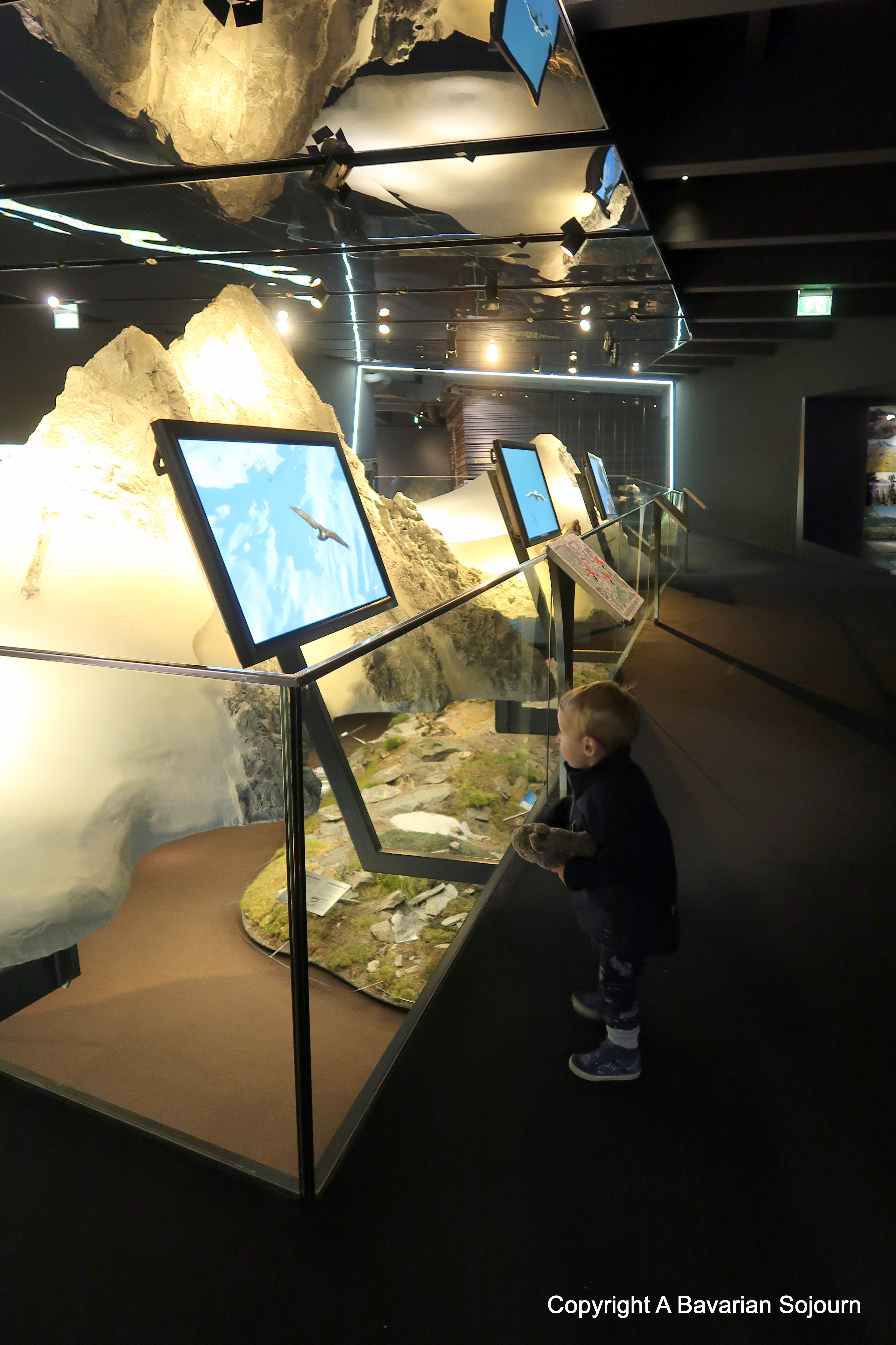 We started off in the shop. Obviously something you typically save for the end of a visit, but as I had discovered that I had forgotten to pack the toddler’s beloved “dog”, and bedtimes were somewhat harder than usual because of that, such a visit was imperative. Alpine cuddly toy section investigated, and small brown bunny (“bun bun” which if you are two sounds a bit like “bum bum”) decided upon, we headed straight to the first room of the exhibit “The Eagle’s Eye View” – which must be quite petrifying if you are rabbit shaped… This room does exactly what it says on the tin, and is a great introduction to the peaks of the National Park. Through the modern wonders of technology, various interactive displays let you imagine what it’s like to fly high above the mountain tops. There’s also a live weather station too if you are desperate to find out whether the rest of your trip is going to be a disaster weather-wise.