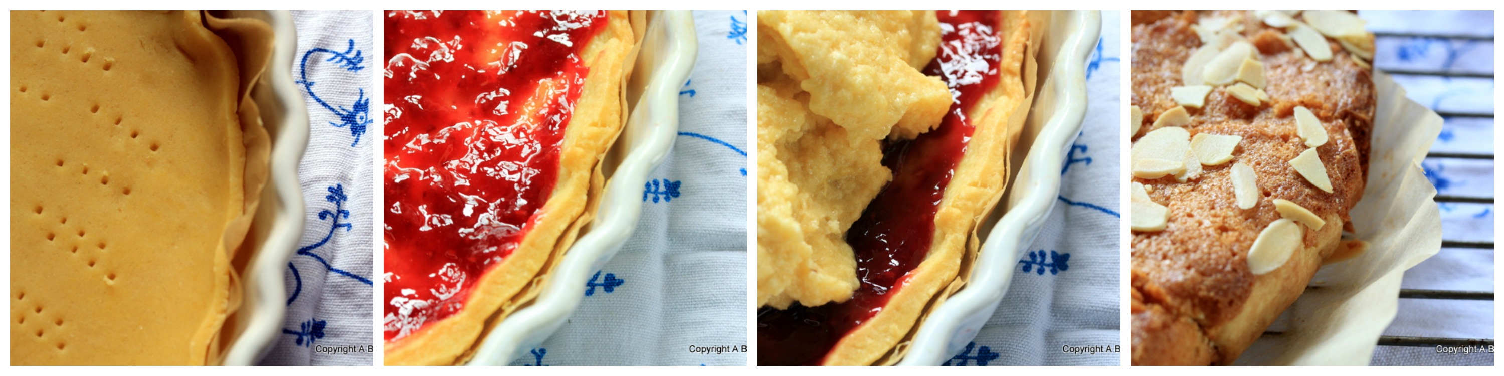 Once the pastry is cool, spread the jam to a thickness of your liking over the bottom of the pastry case. In a food mixer, beat together the butter and sugar, slowly adding the eggs, then add the almond flour and lemon zest. Pour the mixture on top of the jam and spread to the edges of the tin. Bake for 20 minutes, then take out of the oven and sprinkle on the flaked almonds (I think on this occasion, I used around 4tbsps). Put back in the oven to bake for a further 15 minutes or so until risen and set.