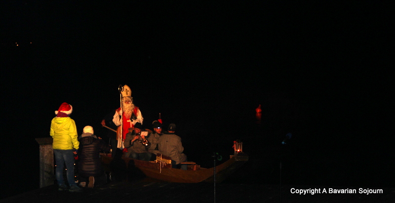 The super friendly owner of the apartment we stayed at just happened to mention that Saint Nicholas would be arriving by boat at the local lake that evening… So, leaving behind Mr R and a super grumpy teething baby (we didn’t think Saint Nicholas would want to meet him that day!), we walked down to the lake just as darkness was falling. A crowd of families had gathered, warming hands over braziers and hot mugs of rum tea and kinder punsch (non-alcoholic gluhwein), while a small group of children from the music school played Saint Nicholas songs. And then it was time. Far across the lake, a little tiny lantern came into view, and gradually as the boat drew closer, music could be heard played by the oompah band passengers, until gradually Saint Nicholas came into view…