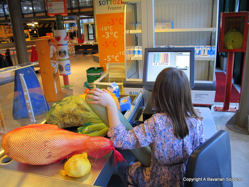 Small boy was of course over the moon with just about every hands on activity he could get his hands on (especially the fire station and the huge water experimentation base!) – it really is perfect for his age group. Thankfully The Nine Year Old’s imagination was captured by the city system, where you get to create an “identity”, find a “job” and earn “money”. This kept her busy for quite some time, and we also had great fun in the “super-market” with it’s fabulous range of Italian Foods to “buy”… Here she dealt with nightmare customers (me!) who insisted on buying “the most ridiculous things” (her words!). She also proved to be a wise bank teller in refusing to allow one particular customer (also me) to fritter their imaginary life savings away on frivolous things. I somehow don’t think she believes in the mantra that the customer is always right!