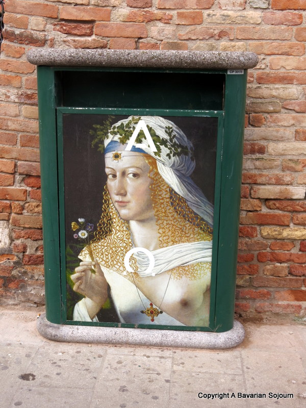 It does seem strange to have art work on a bin, I guess that’s Venice for you. Her hair is amazing, like golden strands of spiral spaghetti.