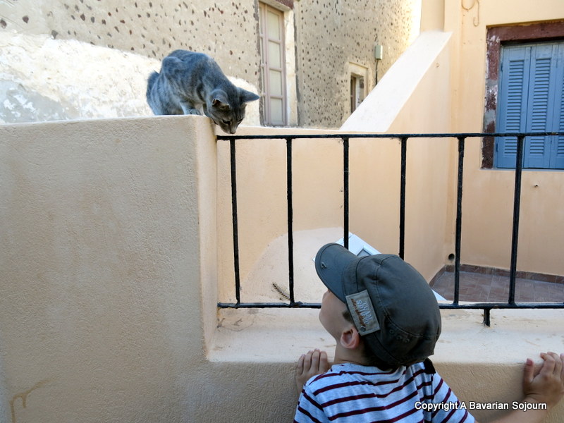 On our first day in Santorini, Small Boy – who had instantly noticed the Island’s vast feline population – announced that in the past, the grand total of five people had told him how good he was at sounding like a cat (a statement followed by a long, mournful and quite authentic miaaoooow)….