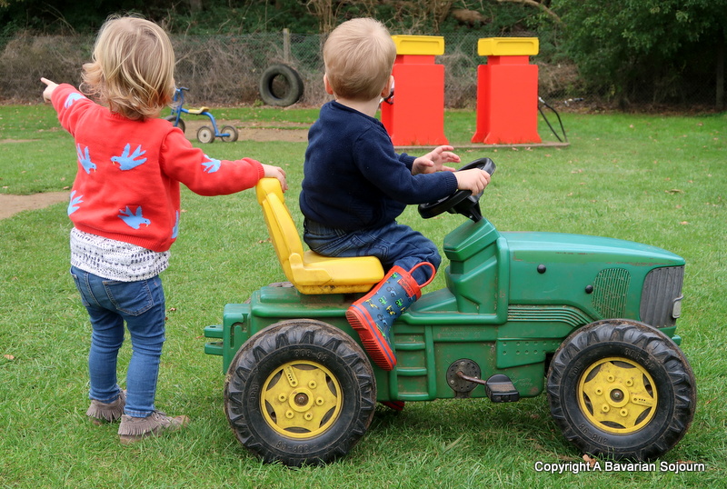 We met my sister and family, and Granny (with the cake!) and started off with a quick walk past the bird of prey display. As he walked down the line, the Birthday boy “introduced” himself to every single feathered friend with a “Hello Bird”, “Hello Bird”, “Hello Bird” until we got to the one in the middle where he stood confused at the creature in front of him that stood taller than he does. Then we had a “Hello…. Cat?!?” It was a very large owl… Afterwards he headed straight off to the pedal tractor section with his cousin who was quite content to push him about for ages! Don’t be fooled by this tiny being, at a few months older than The Toddler, she might be fairy like in stature, but she’s feisty and incredibly strong, and the two of them are quite hilarious together!
