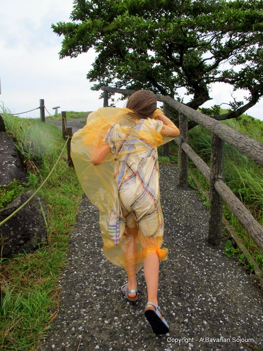 It is said that on a clear day you can see Mount Fuji from the summit. But not today. In fact I would say that the only thing we could clearly see was the orange plastic from our disposable (and very tasteful!) rain macs as they melded themselves to our faces in the wind. We might be a family that travels quite a bit, but we are not always prepared! Anyway, these were considered a necessary purchase given the squally conditions. It’s just a shame they didn’t last for too long (or perhaps not!)! Now at the top, we pressed on.