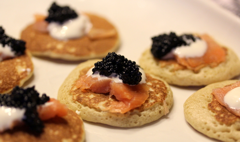 Melt a tbs of butter in heavy bottomed pan, when hot drop in large spoonfuls of blini mix and cook for around a minute until you can see bubbles forming, and the surface looks more or less dry. Flip blinis* and repeat on the other side. Serve warm with your topping of choice… Nearly anything goes really, from smoked salmon, sour cream and caviar, to hummus and avocado, or even jam – it’s up to you!
