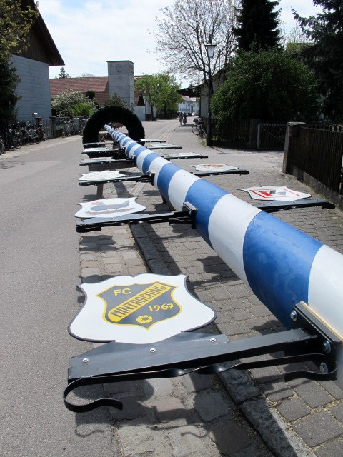 Nearly every town and village in Bavaria has a Maibaum, a vast usually stripey pole (in the Bavarian colours of course!) with its Pagan origins harking back to ancient times. They are quite hard to miss! They also serve as a kind of Bavarian Yellow Pages, with small emblems attached advertising the local businesses and services in the area. I have found myself studying them when I have needed various things (like a garage for example), they are probably more reliable and informative than my ridiculously stupid GPS in any event. The Small People also love them, and when visiting a new place, can be kept quiet for a good ten minutes while they try to guess what the signs are for!