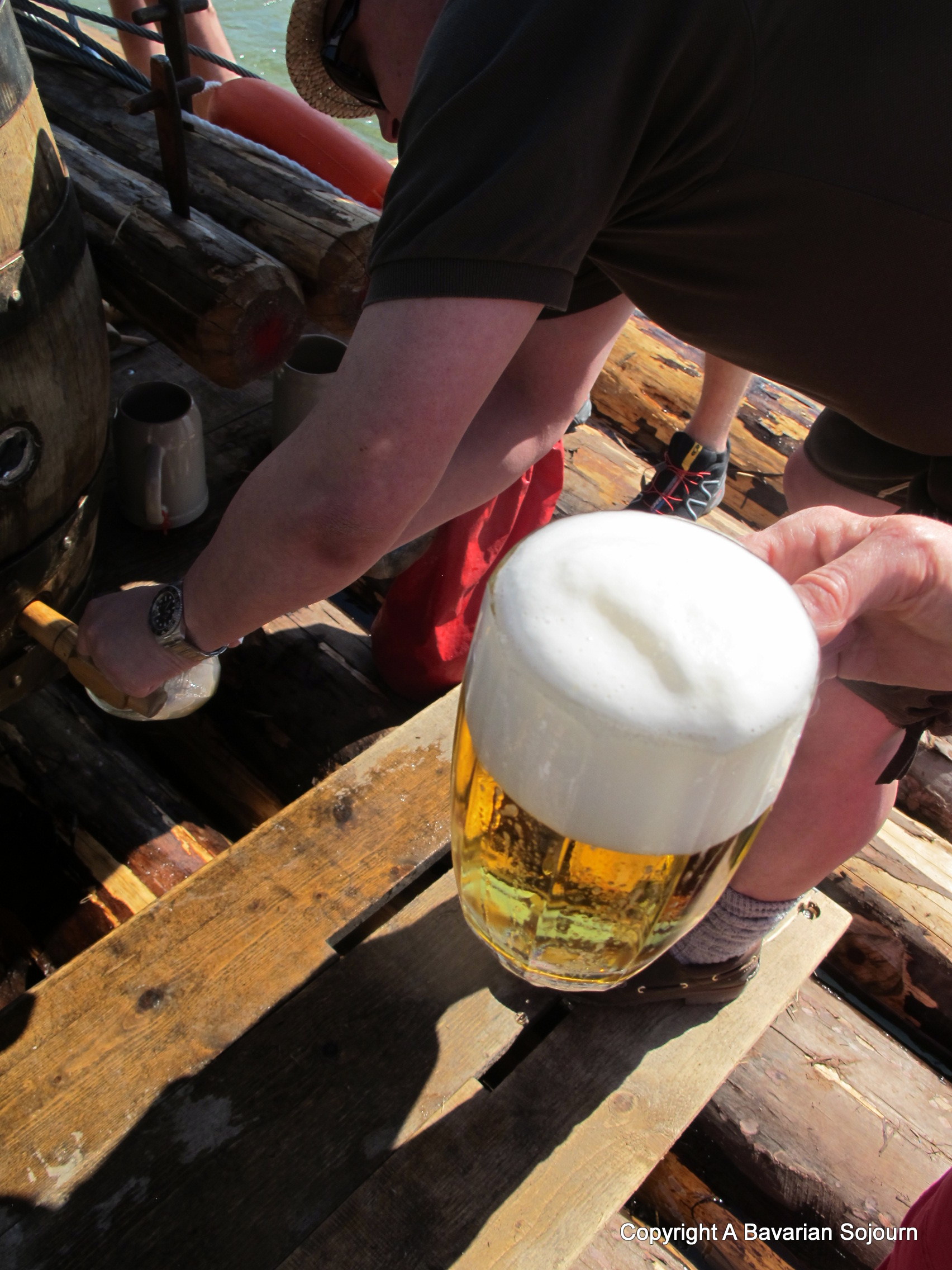 As you might expect for a group of 50 odd people that don’t really know each other, the day started off quite conservatively, with polite conversation and the pointing out of wild birds on the riverbanks, the admiring of antique bridges, and a few polite greetings to fishermen on the banks, who are doubtless used to such spectacles. From the back of the raft the resident oompah band began to play a few gentle Bavarian tunes, then someone ceremoniously tapped the first barrel of beer and that was that – the excuse being it’s not a true Floßfahrt experience unless you have a pure Bavarian bier in hand! I didn’t hear anyone complaining too loudly about it, and before too long, as is the natural progression of such things, everybody felt like they had known each other for years.