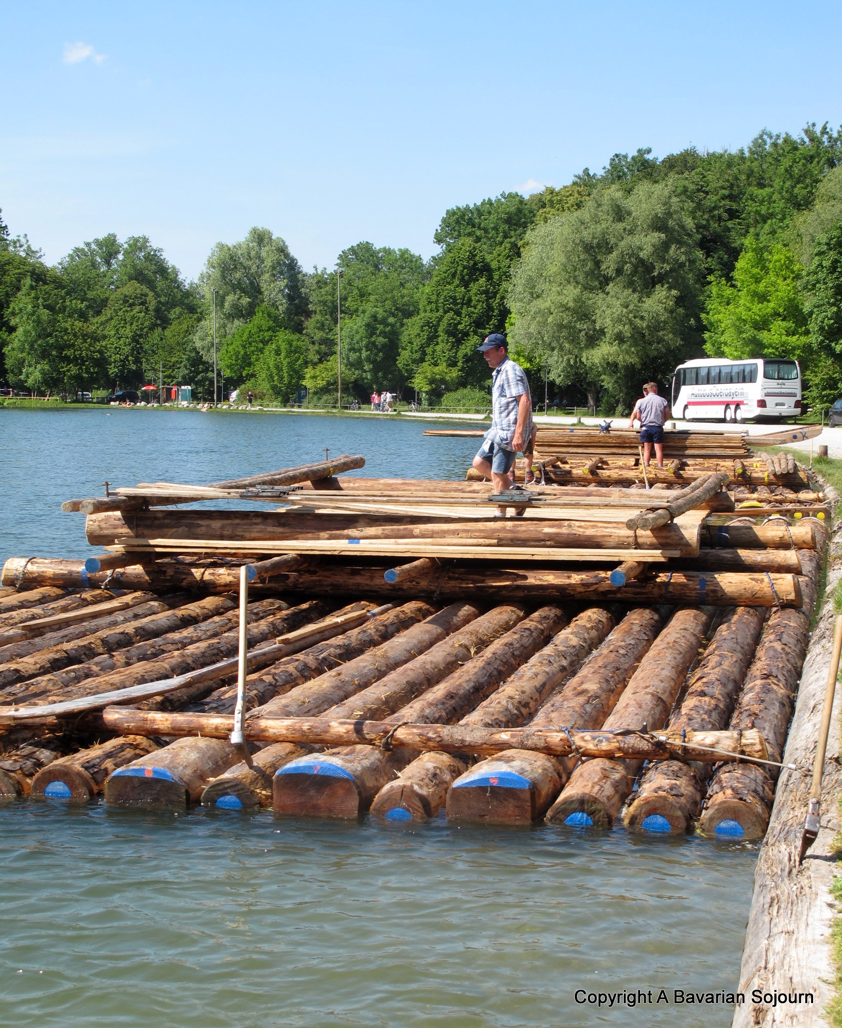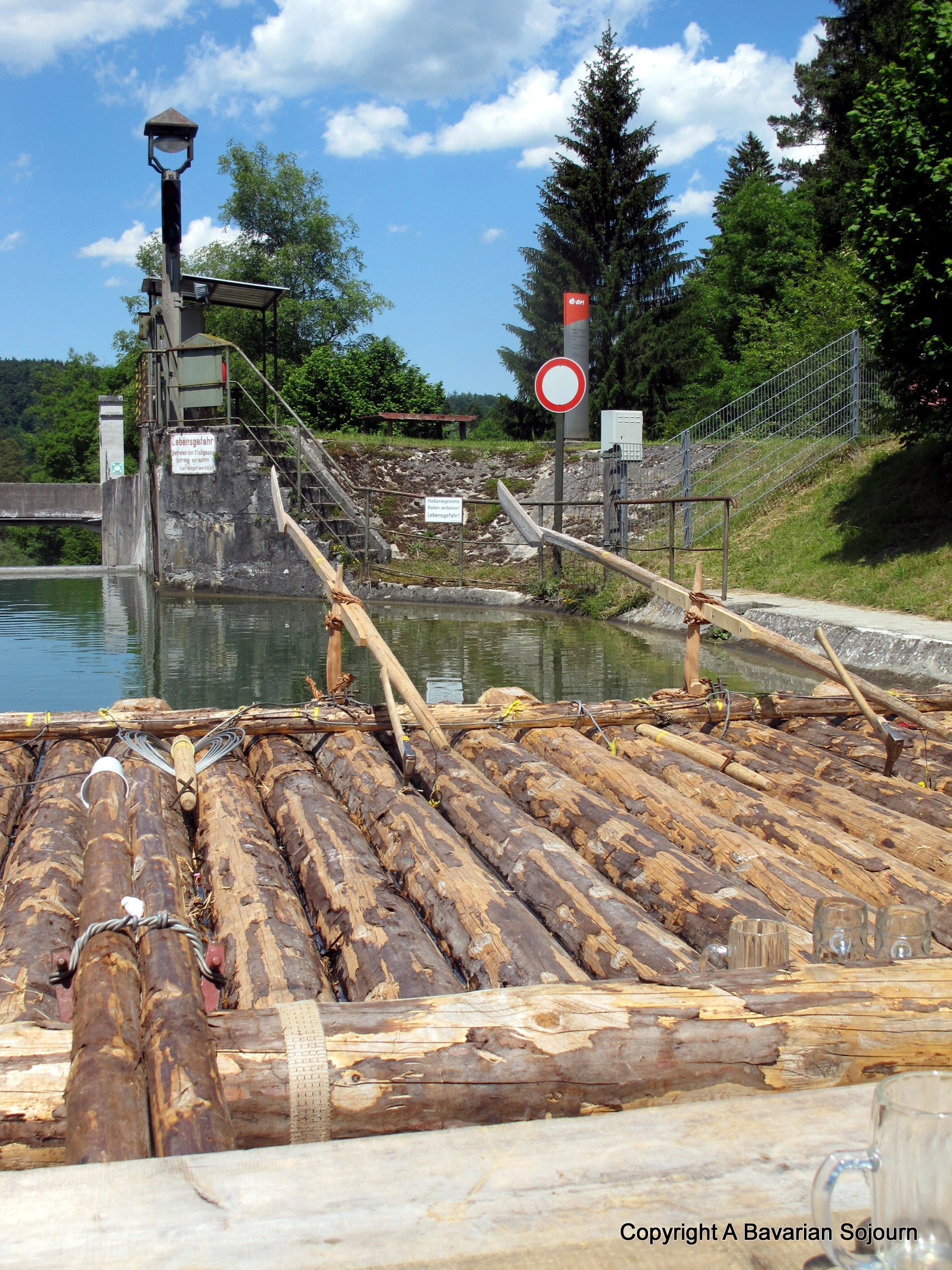 After the 40 minute drive to picturesque Wolfratshausen some 30 kilometres south west of Munich, we turned a corner to the banks of the river, where our floating chariot awaited (along with at least 15 others!) having been put together that very morning (the rafts are taken apart at the end of each journey, the tree trunks are plonked on to the back of an artic and taken back to the start once again for a repeat Floßfahrt the following day- no mean feat given the size of everything, and the fact it’s like a giant jigsaw to put back together again!)… Then, after loading some extra supplies for the day and taking our seats on slightly bouncy benches, the oarsman pushed us away from the edge of the riverbank, and our journey began…