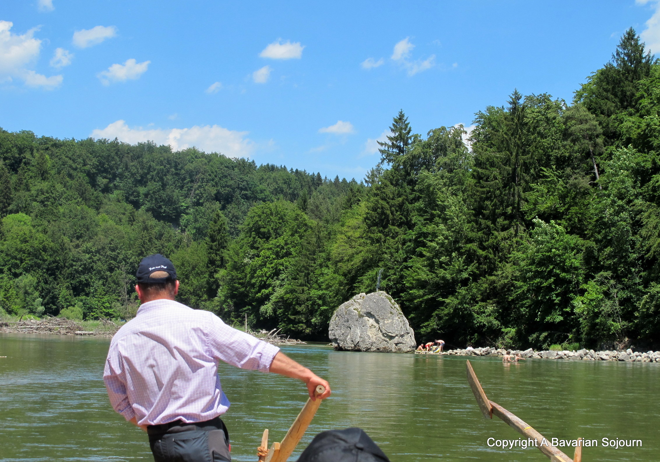 On we glided past yet more spectacular scenery, and as the day progressed and the sun got higher in the sky (and as the people around me got pinker and pinker still) I was suddenly grateful for that pub umbrella – especially as one of those types of English people that the German’s lovingly term “shade lovers”. Thankfully though, more leafy shade was in sight as a little like an oasis appearing on the horizon, we found ourselves stopping off at a beautiful riverside bier garten for lunch (included in the price!) along with the passengers from the other rafts. You don’t see much of the other rafts by the way, there’s usually plenty of space between them… It was interesting to note the mix of people – from the traditionally dressed (and by now perspiring!) to the not so, and the rather reserved, to the definitely not so…