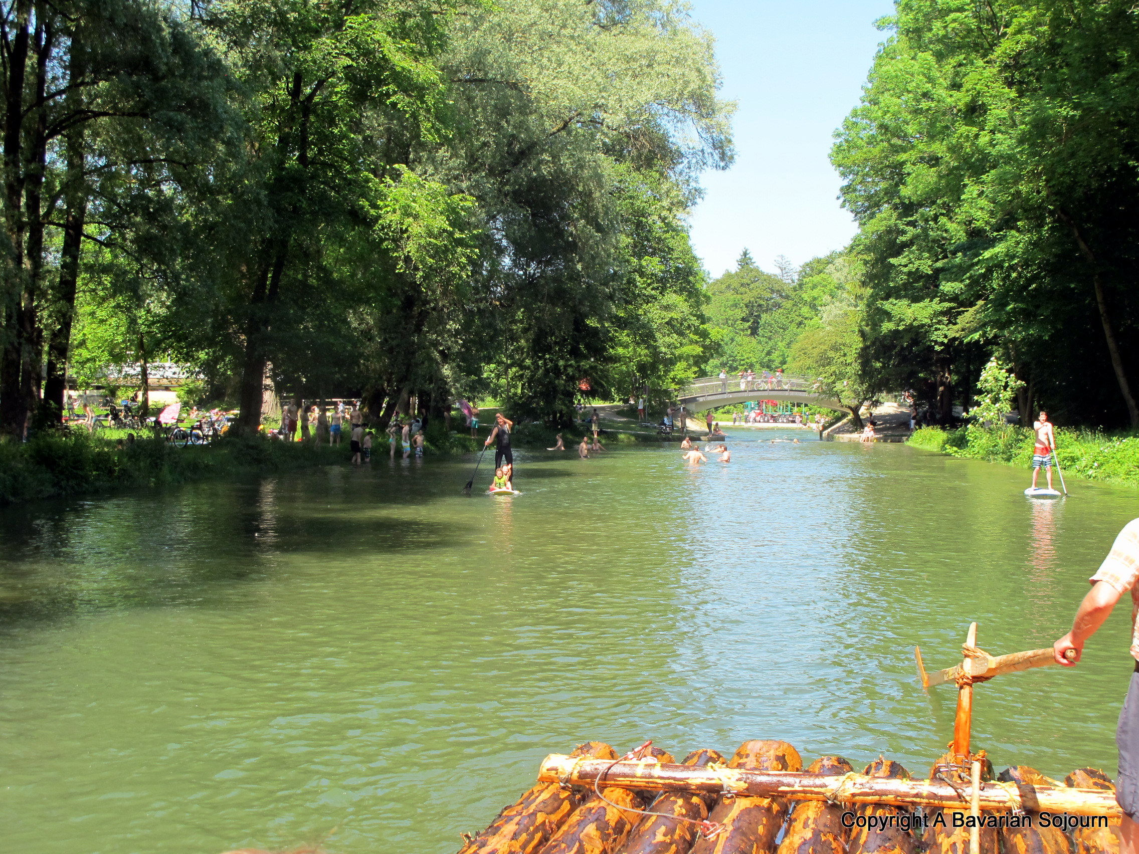 By now we were gradually edging closer into Munich, and the quiet countryside gradually gave way to more buildings and more and more people along the riverbanks. It’s not uncommon to experience Floßfahrt pirates as you get closer into town, as a few boys chance their arms climbing on board to see if you have any bier left – it’s all part of the tradition, and anyway they were unlucky on our raft, as by now all barrels were empty! Until eventually the raft passed into the very edges of the Englischer Garten at Thalkirken.