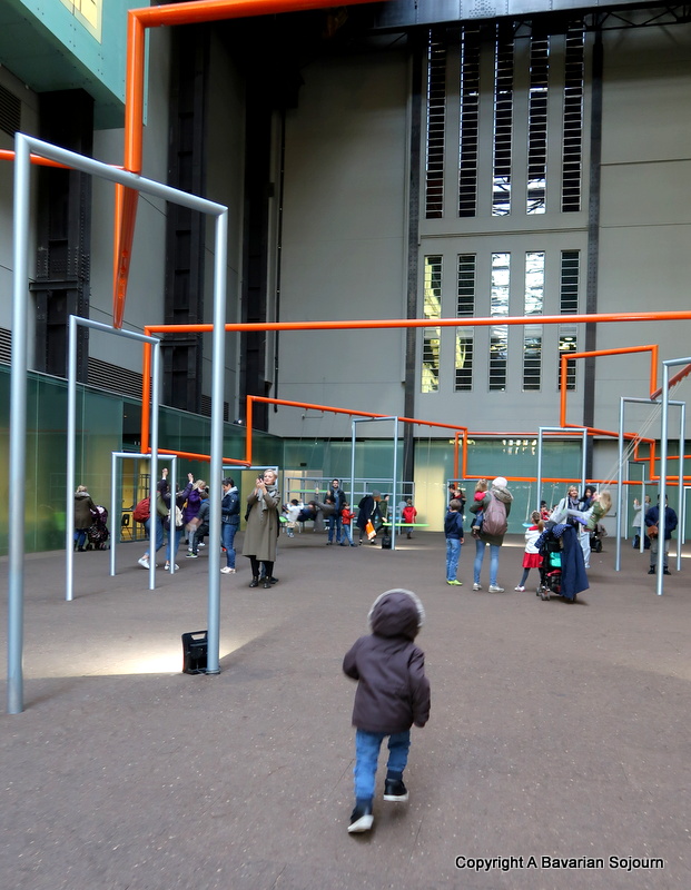 The Tate Modern’s main Turbine Hall tends to be the place that most families like to spend time in once the more serious art inspecting is out of the way. It usually has some installation that is fun in some way or another. This visit we enjoyed hanging around on the giant “One Two Three Swing” exhibition, which judging by the swings and chains piled up in one corner could be adjusted and moved about on the frames depending on who’s in charge of the gallery that week. Each two/three person swing is supposed to represent “combating social apathy through collective action” – but if you are only two, it just signified sitting squashed between your siblings screaming to go higher… And that’s the thing about art, whatever your interpretation, as long as it provokes some kind of reaction that’s the whole point?